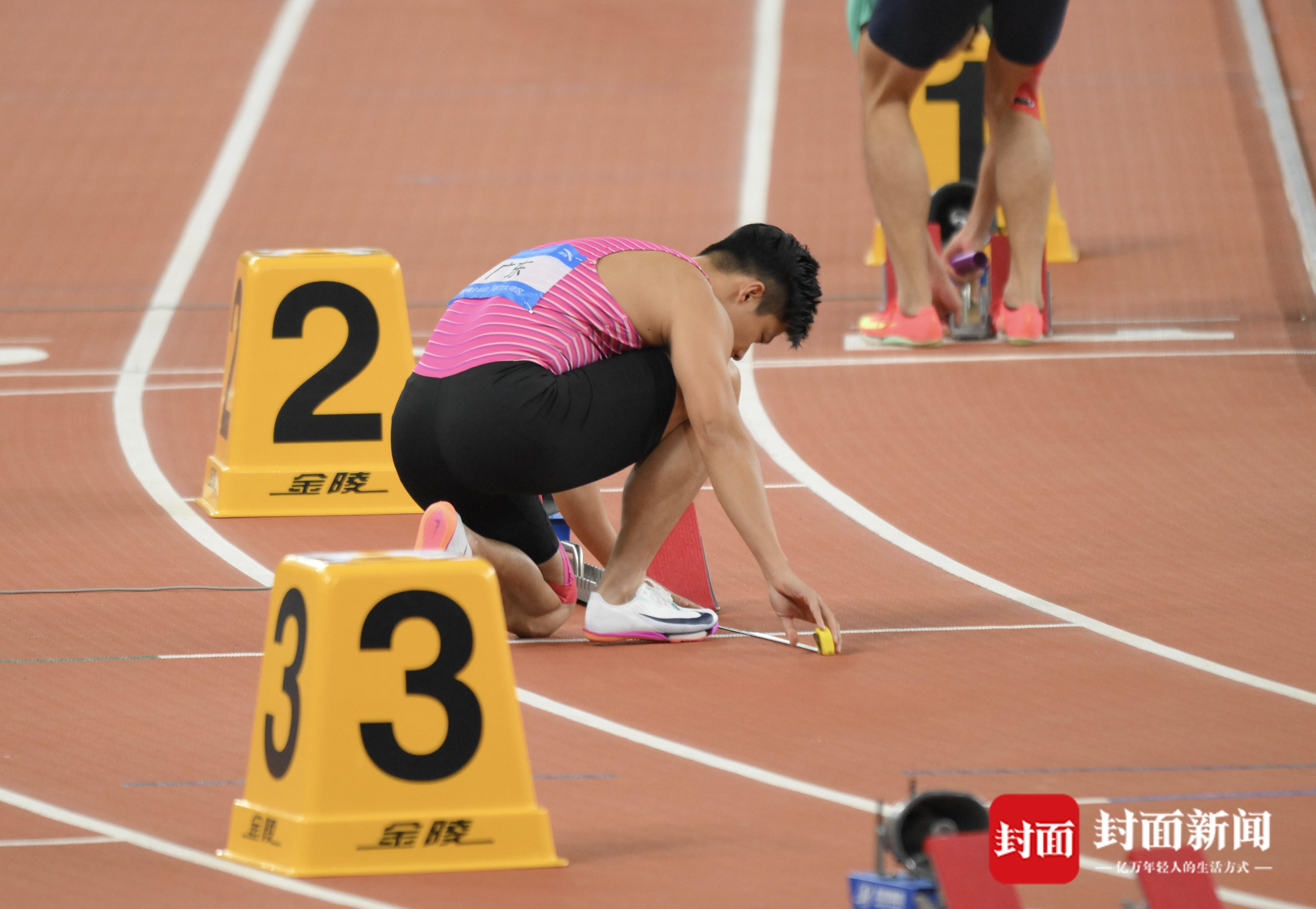 苏炳添赛前仔细测量起跑器